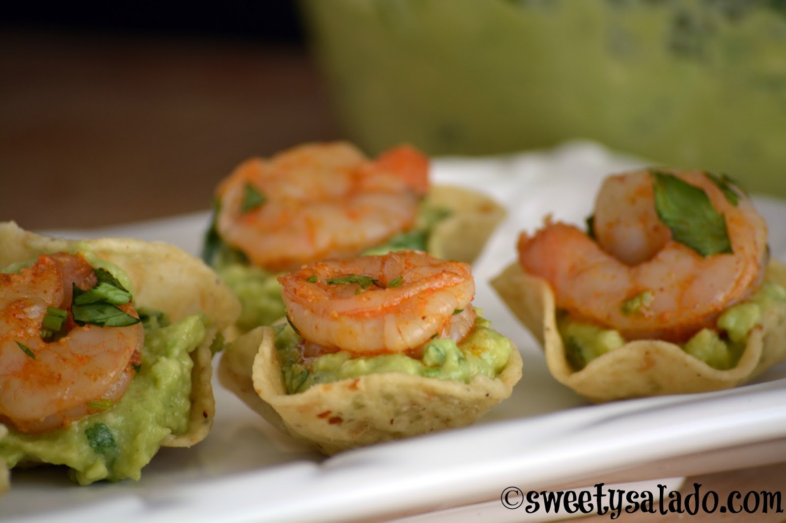 - To assemble the appetizers, place about 2 tsp of guacamole on each chip and then place a single shrimp on the guacamole. Serve immediately.