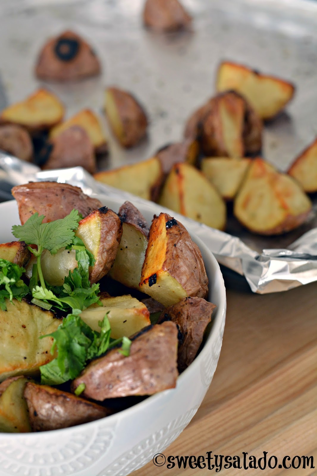 - Coloca las papas en una lata para hornear y hornéalas por 45 minutos a 1 hora, o hasta que estén doradas. Asegúrate de revolverlas a mitad de cocción para que se horneen por todos lados. Remueve las papas del horno, agrega el cilantro y sírvelas inmediatamente.
