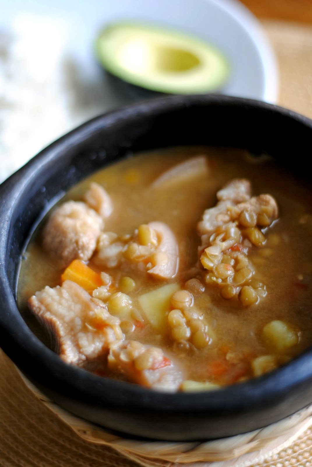 Una de las comidas que más me hizo falta cuando me fui a vivir a mi propio apartamento fueron las lentejas que hacía mi mamá. Ella no las hace de una forma diferente o especial y es más como un sudado de lentejas que sopa, pero tienen muchísimo sabor colombiano. Un día el antojo fue tal que me fui directo a la tienda después del trabajo para comprarme una bolsita de lentejas, las cociné tal como lo indicaban las instrucciones básicas del paquete y me las comí toditas. No me importó que hubieran quedado secas y simples porque estaba contentísima de haber podido comer lentejas y variar el menú de siempre. Desde entonces he cambiado un poquito esa receta tan básica. Le agrego tomates, vegetales y una de mis carnes favoritas que es el chicharrón. La combinación de cualquier tipo de carne de cerdo con las lentejas tiene algo que me encanta y siempre la agrego.